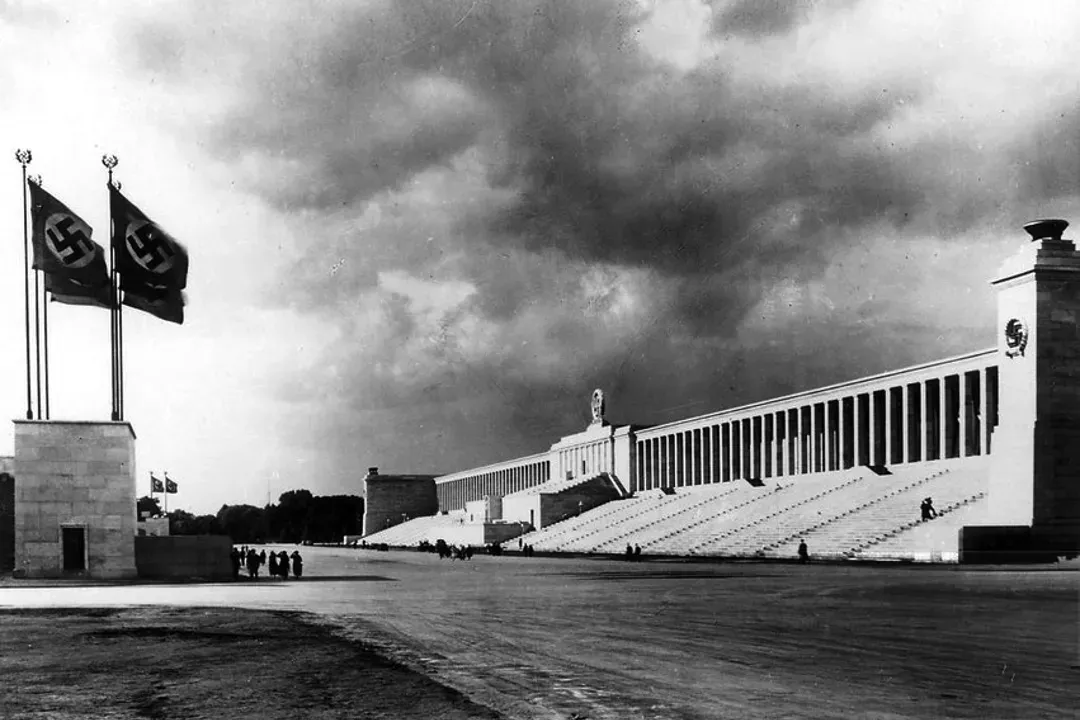德國紐倫堡德國納粹黨的大會場佔地約11平方公里,1933年至1938年期間舉辦了六次大會。場地包括路特普耳達競技場,最初的會議廳,新的會議廳,可坐50,000人的軍事進行場,最大的體育館,以及用於Wehrmacht的展示場地。1933年8月30號,希特勒宣佈紐倫堡為「德意志帝國大會場城市」。金色大廳位於進行場內的齊普爾特塔,已經保護了73年,是納粹建築的代表作。目前,整個地區都是紀念碑。自1947年以來,每年的諾里斯林賽車週末會舉行活動,2004年以來一直舉行Rock im Park搖滾音樂節。「榮譽大廳」於1929年舉辦的黨大會中首次進行了納粹民族主義的死亡崇拜儀式,但1945年初被盟軍轟炸後受損,後來又被改建為停車場。現在,該建築中的大理石樓梯仍完整無損,自1938年9月德意志帝國黨最後一次大會以來,這14根柱子尚未燃燒。而會議廳是由紐倫堡建築師路德維希和弗蘭茲魯夫設計的,影響來自於羅馬的鬥內廳,1935年奠基,但沒有屋頂,也沒有完工,目前已被列為古蹟保護建築。「大道」長約且寬,直通「御林陣」,是整個會場的中心軸線,意圖把納粹時代的紐倫堡與中世紀的紐倫堡聯繫起來。90年代後期,美軍曾把該地區做為臨時機場。目前,該地區已改建為紅屋區,也延伸到曾用於納粹黨大會的帳篷營的區域。「KdF-Stadt」位於會場的東北部,曾在木製展覽廳中介紹和舉行遊樂活動。