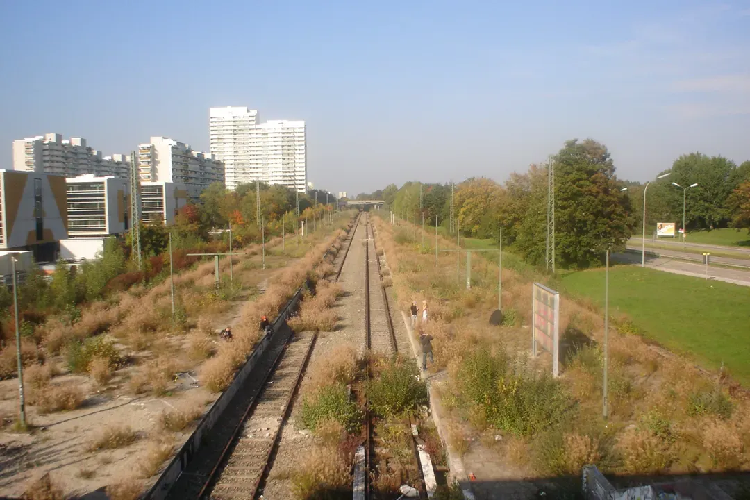 「慕尼黑奧林匹克體育場(München Olympiastadion)原本是慕尼黑S-Bahn的一座駐站。 1972年,這座車站建成並於1972年5月26日開通,為1972年夏季奧運會提供額外的交通方式。在奧運會期間,該車站經常使用,但之後便與普通服務網絡封閉了聯繫。該車站會在附近的奧林匹克體育場舉行足球比賽時偶爾使用。從1984年8月8日起,S8和S11服務線經由該車站前往體育場。該車站於1988年正式關閉,該車站所屬的鐵軌在2003年被拆除。車站總共有兩座島式站臺,共有四條鐵軌。其中兩條在車站停靠,另外兩條向南延伸。進入該車站是通過所謂的“北環線”,即一條通常只用於貨運的鐵路線。在奧運會期間,火車從阿拉赫和莫奧薩克以及約翰內斯基爾來自西面,還有來自東面的火車。後來,車站採取了單向運行,即火車從西面到達,然後向東方離開。此後,在1988年UEFA歐洲足球錦標賽的最後一場比賽結束後,該車站正式關閉,並已遭到破壞。為了便於挖掘慕尼黑地鐵U3線的隧道,車站所屬的軌道於2003年斷開。慕尼黑中央車站和機場之間的超級快車線計劃使用原先的S-Bahn和貨運列車的通行權,離開車站向南約500米就是Borstei地區,但由於成本上升,該計劃最終被取消。