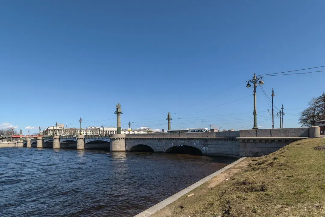 「Ushakovsky橋樑橫跨聖彼得堡波爾夏尼瓦卡河,以艦長豐多爾·烏沙科夫斯基為名。最初於1786年建成的浮動碼頭橋,於1847-1853年間重新建成多跨木橋。1906年、1911年和1935年進行裝修,而現有的版本則是於1953-1955年建成的。現今橋樑總共11段跨度,中間那段是雙翼可滾動的提升式橋樑,其他段跨越都是連續梁。橋身基座以花崗巖為面材,橋梁長度約達並且極寬。